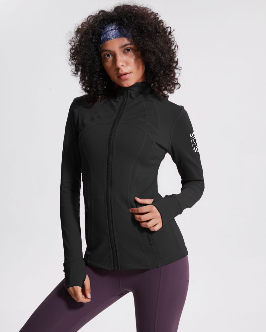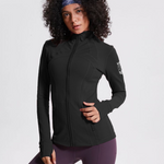 A sleek scuba jacket with secure front pockets, thumbholes and a back vent for airflow. This scuba jacket will contour to your body and become your go-to layer. Stay warm on the coolest mornings in this transitional, flattering mid weight jacket.