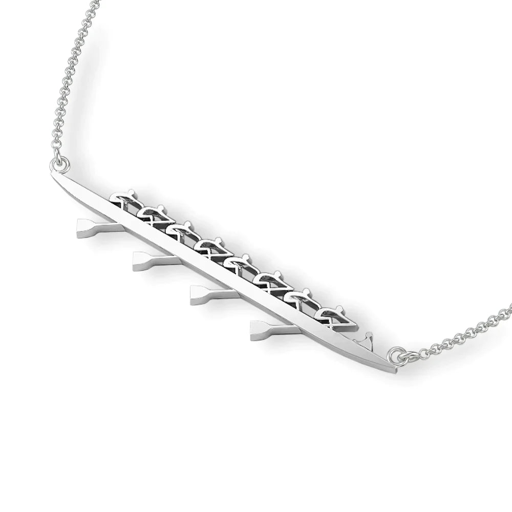 Earn your seat in the boat and celebrate it with our sterling silver Rowing Eight Necklace featuring a Coxswain. This is not just jewelry; it's a symbol of your dedication and achievement in the world of rowing.